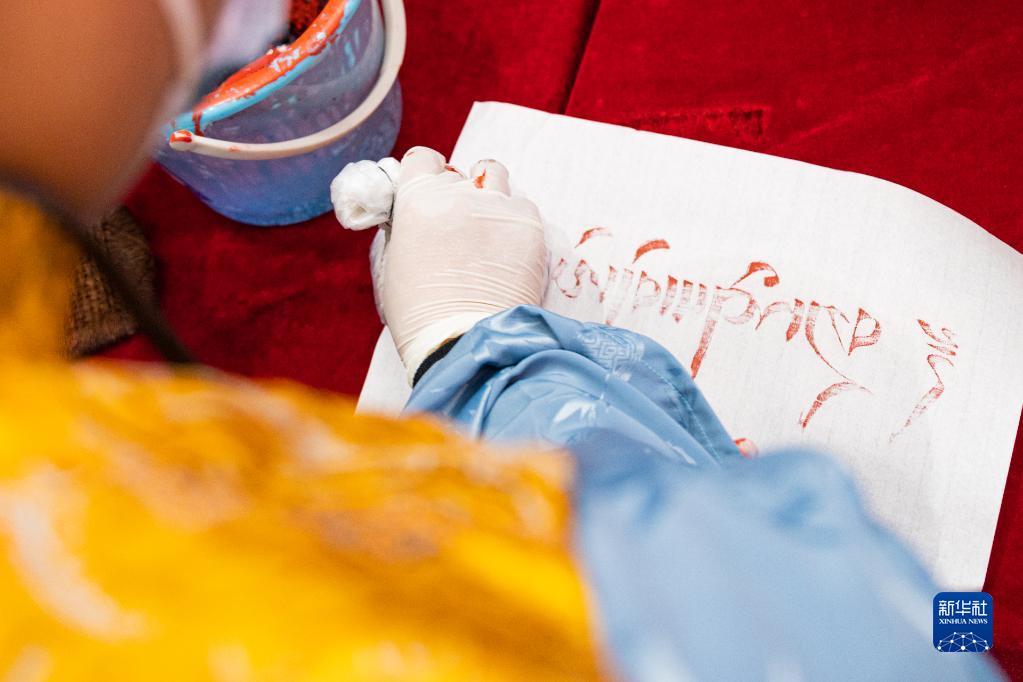 2月22日,西藏博物館工作人員將刻有“紮西德勒”的木刻印刷在紙上。新華社發(丁增尼達 攝)