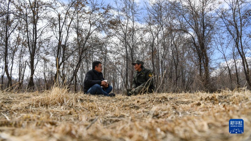在西藏山南市隆子縣,紮西江村(左)與(yu) 護林員在林中席地而坐,交流當地生態環境問題(2月14日攝)。新華社記者 晉美多吉 攝