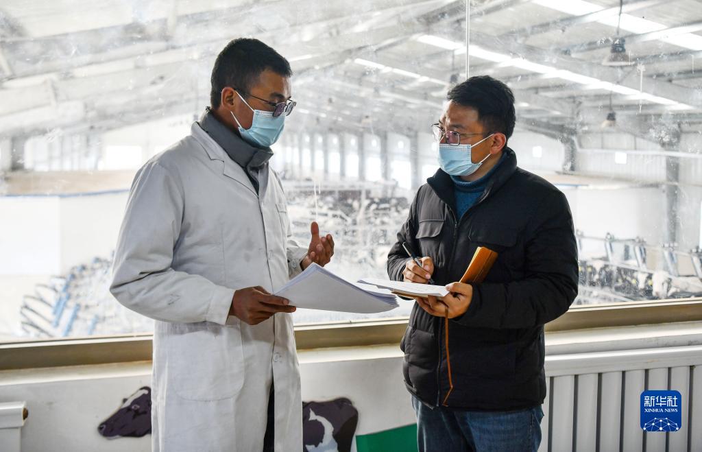 紮西江村(右)在隆子縣一家標準化奶牛養(yang) 殖基地調研當地產(chan) 業(ye) 發展和帶動群眾(zhong) 增收情況(2月14日攝)。新華社記者 晉美多吉 攝