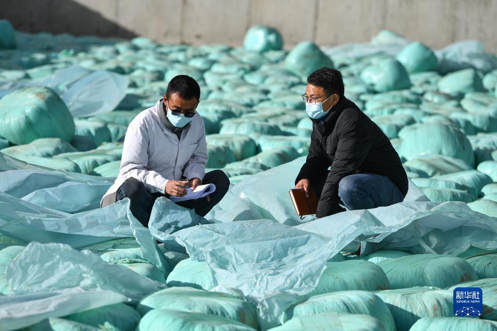 紮西江村(右)在隆子縣一家標準化奶牛養(yang) 殖基地查看牛飼料,調研當地產(chan) 業(ye) 發展情況(2月14日攝)。新華社記者 晉美多吉 攝