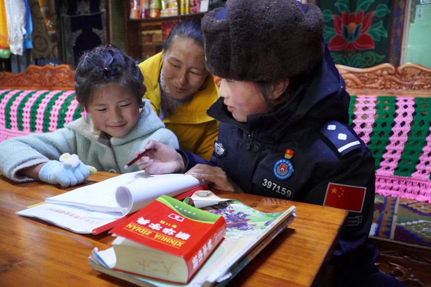 為(wei) 孩子輔導作業(ye) 。圖片由玉麥鄉(xiang) 邊境派出所提供