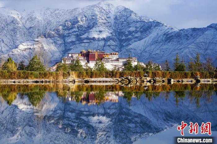 圖為(wei) 遊客在拉薩南山公園與(yu) 布達拉宮雪景合影。江飛波 攝
