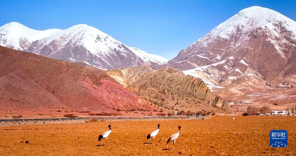 在拉薩市林周縣,黑頸鶴在雪山腳下的農(nong) 田裏覓食(3月1日攝)。新華社記者 沈虹冰 攝