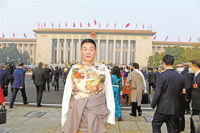 圖為(wei) 全國人大代表紮西尼瑪在人民大會(hui) 堂前拍照留念。記者 李洲 攝