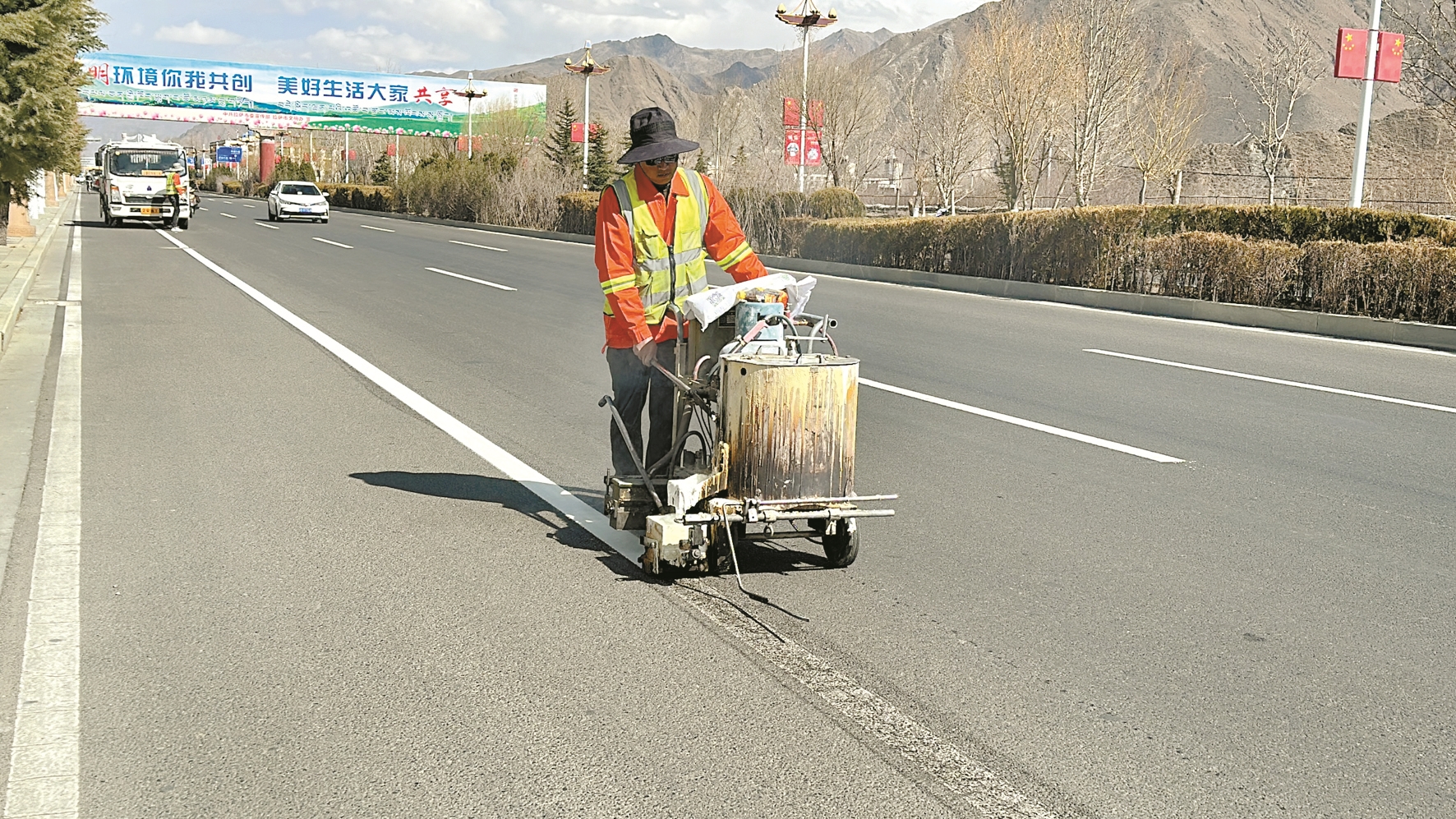 圖為(wei) 工作人員正在南環318沿線施劃交通標線。 拉薩融媒記者 左曉萌攝