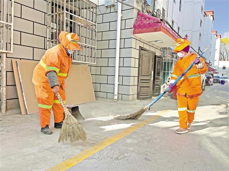 拉薩市城關(guan) 區女環衛工人在清掃地麵。 旦增蘭(lan) 澤 攝