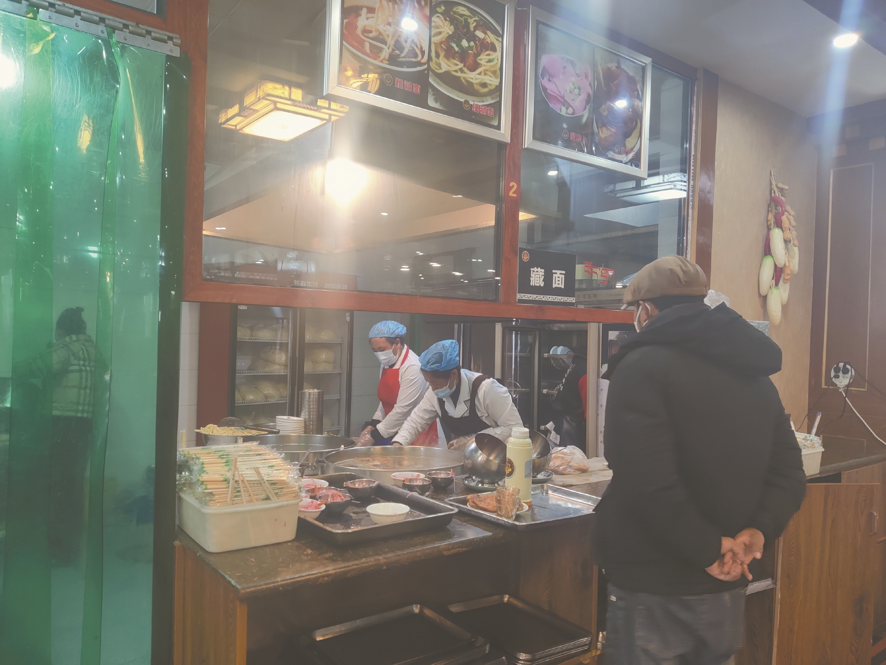 一大早,位於(yu) 城關(guan) 區仙足島的嚓榮魯突陸藏餐館續迎來顧客。檔口內(nei) ,工作人員在各自崗位上忙碌著。抓一把麵,放上牛肉丁,撒上香蔥,再澆上一勺牛肉湯,一碗熱氣氤氳、香味四溢的藏麵新鮮出鍋,再配上甜茶和肉餅,美好的一天就在此刻開啟。作為(wei) 一家連鎖店,嚓榮魯突藏餐館在拉薩市區及各縣(區)、地市共有17家分店,在食材、衛生等方麵,均采取嚴(yan) 格統一的管理標準。