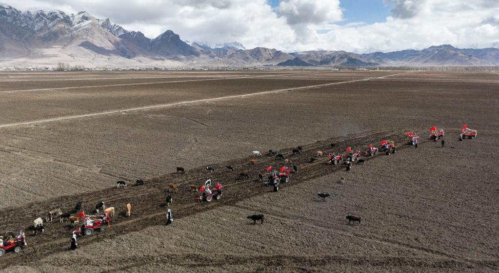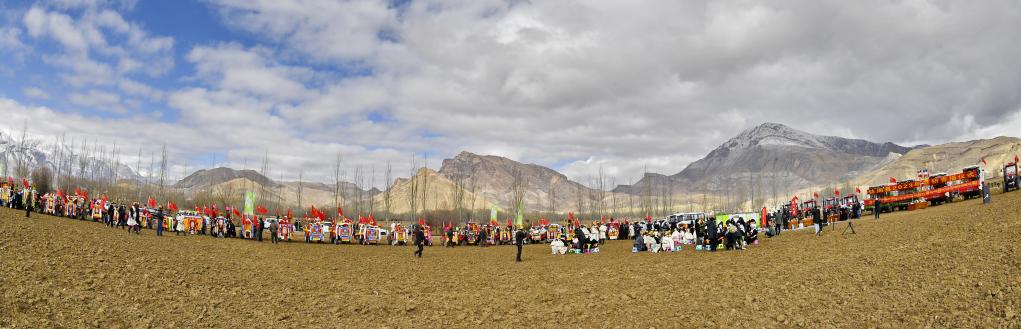 西藏林周縣強嘎村的春耕儀(yi) 式(無人機照片)(3月16日攝)。新華社記者 晉美多吉 攝