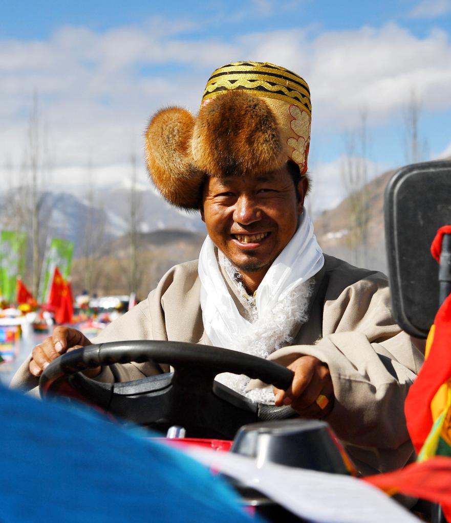 56歲的紮西次仁頭戴圓筒帽,身穿白色氆氌,腳蹬黑色靴子,開著五彩哈達和鮮花裝束的拖拉機來到開耕現場。“對農(nong) 民來說,春耕秋收是一年中最重要的事情,每個(ge) 人都要盛裝打扮出席。”他說。