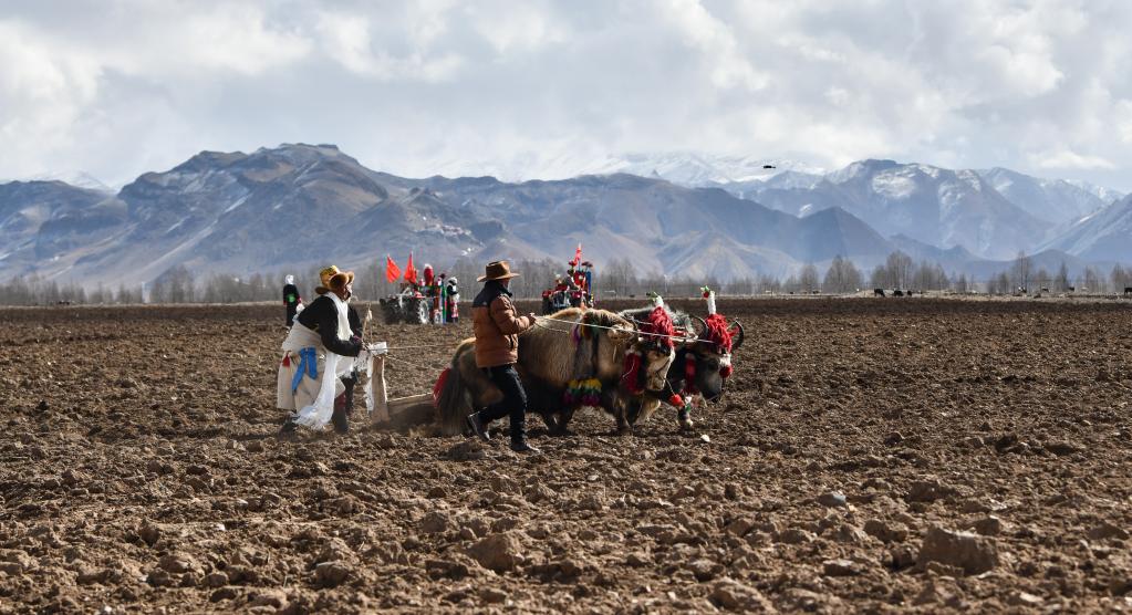 春耕儀(yi) 式上,古老的“二牛抬杠”耕作方式已經成為(wei) 僅(jin) 具象征意義(yi) 的儀(yi) 式(3月16日攝)。新華社記者 晉美多吉 攝