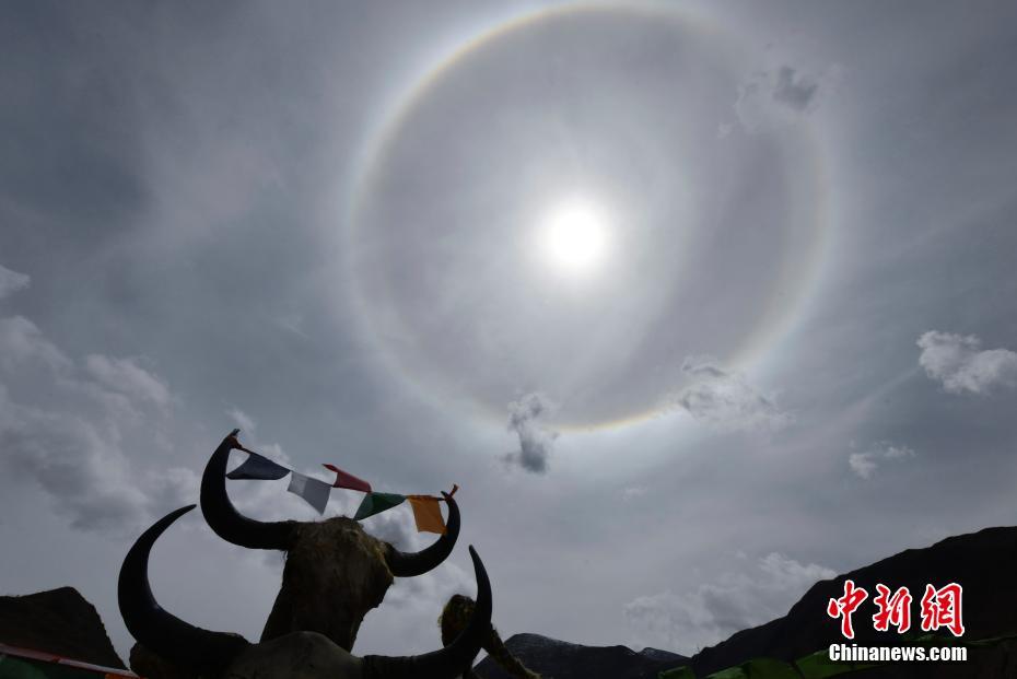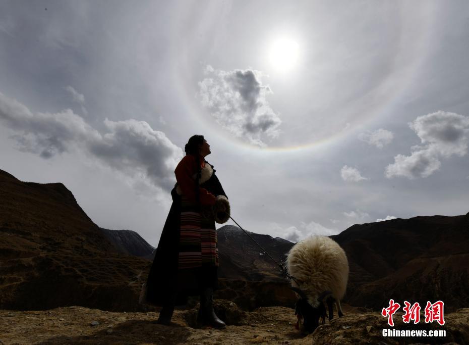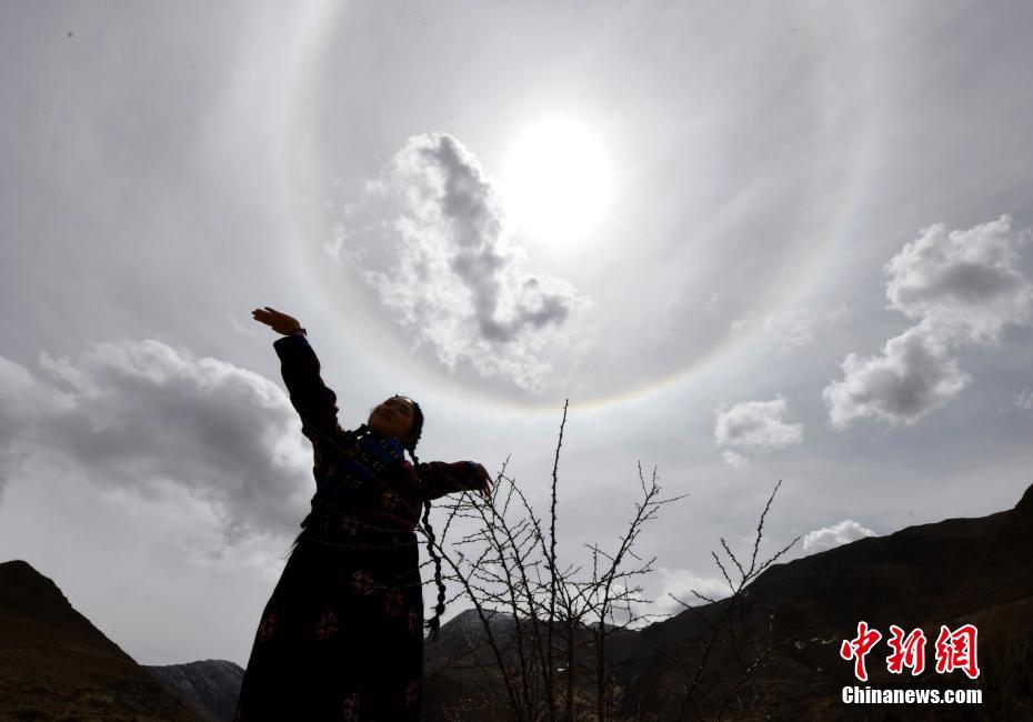 3月20日,西藏拉薩,身著藏裝的遊客與(yu) 日暈相映。李林 攝