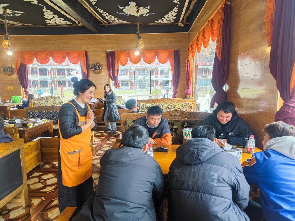德吉旺姆(左一)正在農(nong) 莊招待前來就餐的遊客(3月26日攝)。新華社記者王澤昊 攝