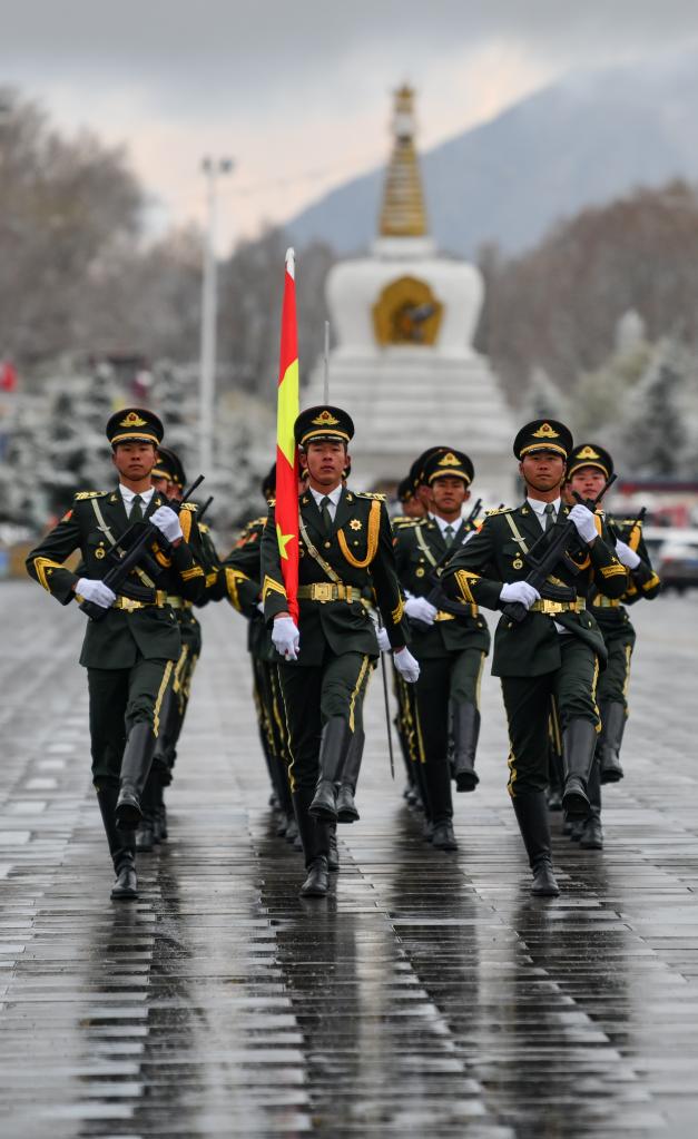國旗護衛隊邁著整齊劃一的步伐,把五星紅旗送到廣場升旗處(3月28日攝)。新華社記者晉美多吉 攝