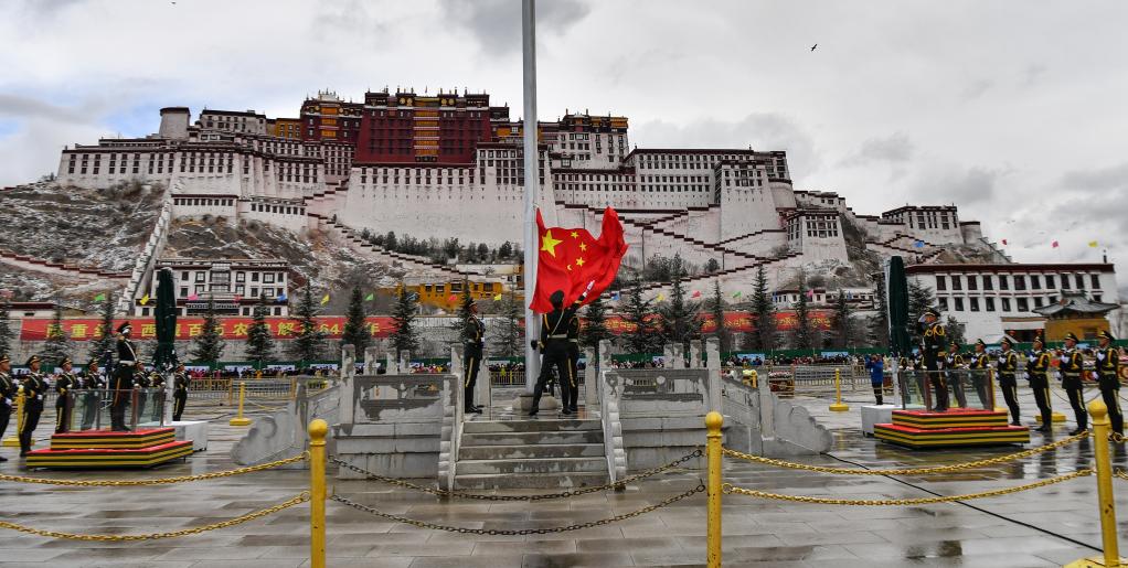 布達拉宮廣場舉(ju) 行升旗儀(yi) 式(3月28日攝)。新華社記者晉美多吉 攝