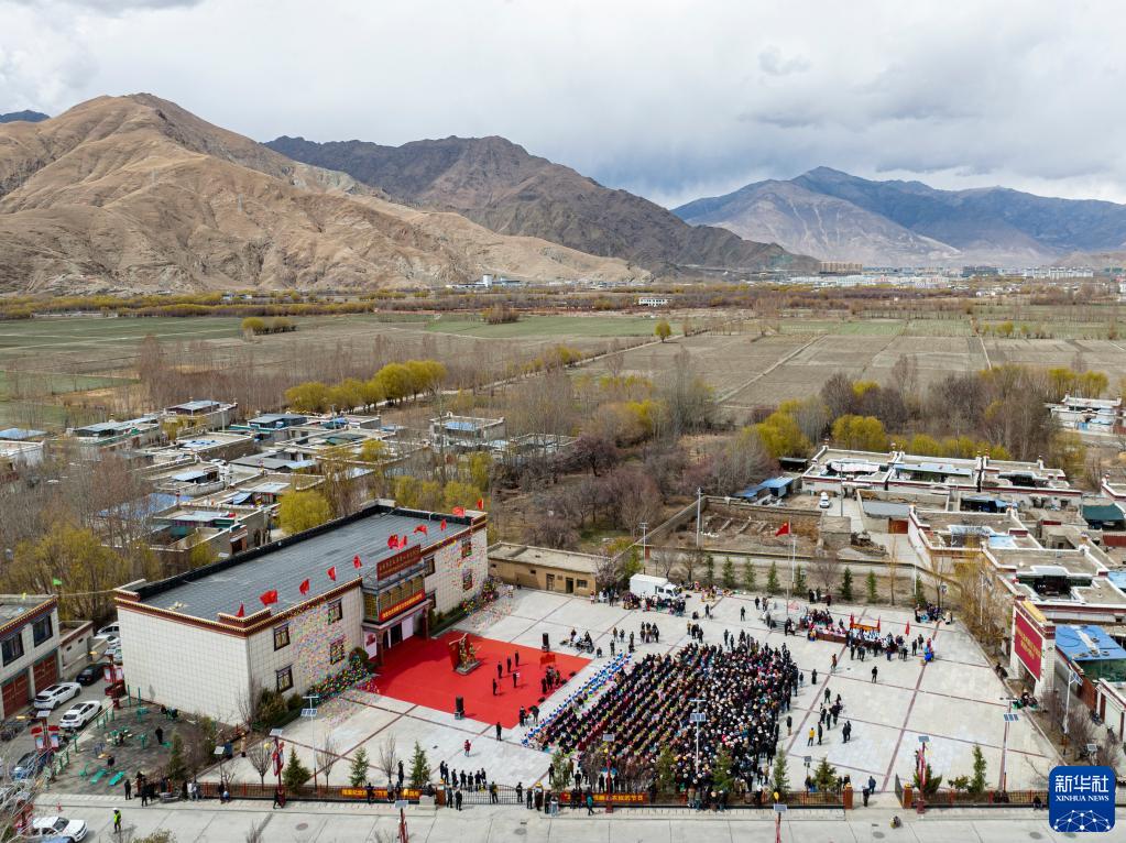 3月28日,在山南市乃東(dong) 區,西藏民主改革第一村陳列館重新開放,人們(men) 在陳列館前舉(ju) 行儀(yi) 式,紀念西藏百萬(wan) 農(nong) 奴解放64周年(無人機照片)。新華社記者 孫非 攝