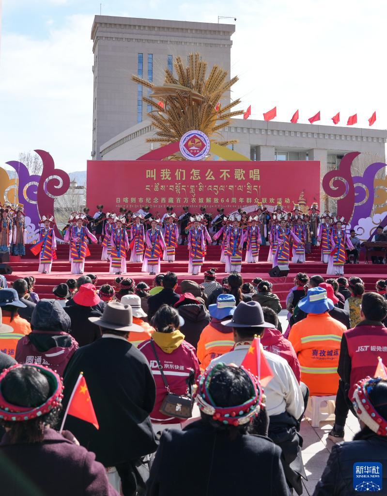 這是3月28日拍攝的日喀則市紀念西藏百萬(wan) 農(nong) 奴解放64周年群眾(zhong) 聯歡活動現場。新華社發(何金龍 攝)