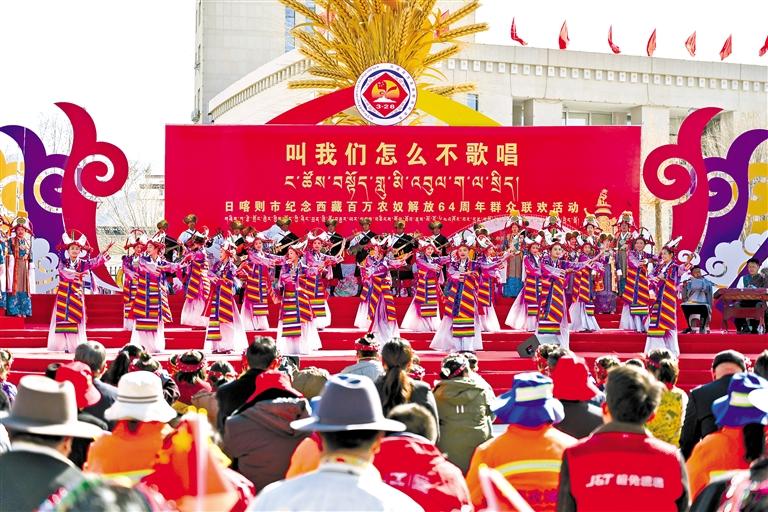 圖為(wei) 為(wei) 日喀則市紀念西藏百萬(wan) 農(nong) 奴解放64周年群眾(zhong) 聯歡活動現場。