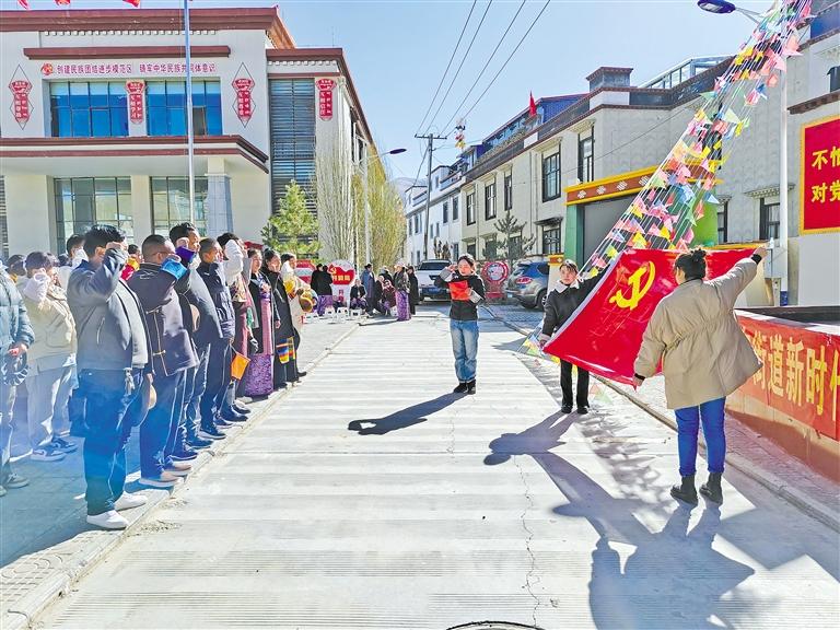 圖為(wei) 桑珠孜區城東(dong) 街道黨(dang) 工委組織幹部職工重溫入黨(dang) 誓詞。