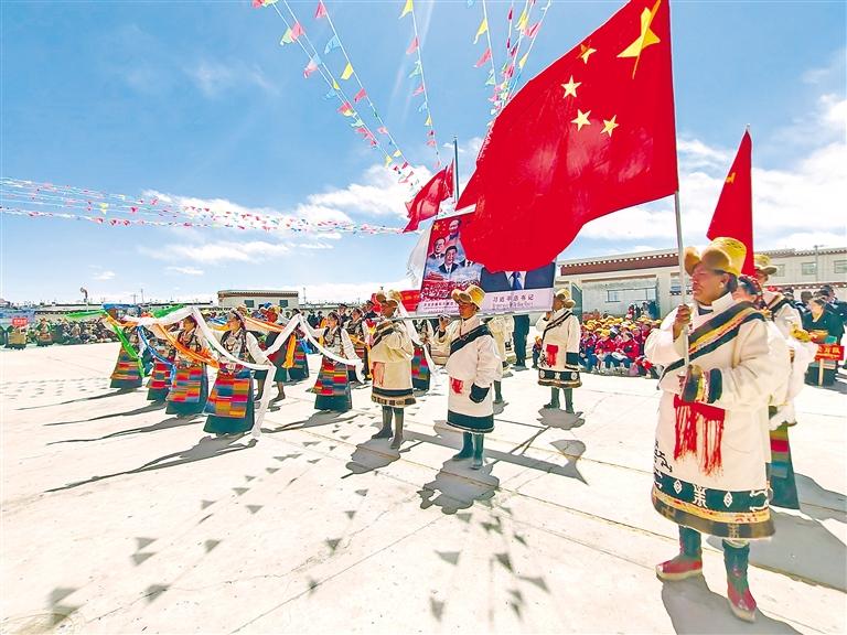 悠揚的歌聲獻給黨(dang) ,歌唱黨(dang) 的英明領導;歡快的舞蹈跳起來,跳出人民幸福生活。從(cong) 珠峰腳下到年楚河畔,從(cong) 高原牧場到山穀林地,處處升起麵麵五星紅旗,讚美共產(chan) 黨(dang) 的歌聲響徹天際,匯聚起強大動能。