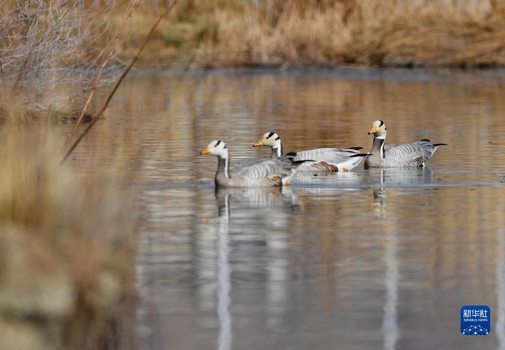 斑頭雁在拉魯濕地遊弋(3月30日攝)。新華社記者 張汝鋒 攝