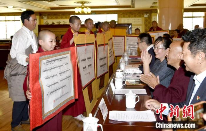 2022年7月,西藏佛學院9名少年活佛完成小學階段學習(xi) ,在拉薩順利畢業(ye) 。圖為(wei) 少年活佛們(men) 在畢業(ye) 典禮教育成果展上展示藏漢書(shu) 法作品。李林 攝
