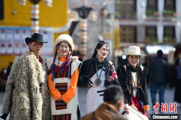 西藏拉薩,身著藏族傳(chuan) 統服飾的遊客在八廓街拍照留念。貢嘎來鬆 攝