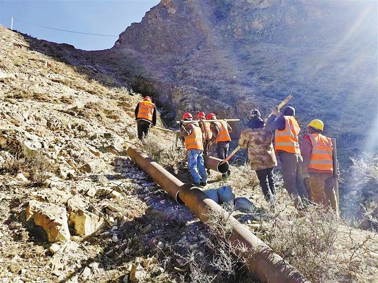 圖為(wei) 中鐵二十一局工人在巴嘎雪片區將主鋼管轉運至焊接點位。 記者 楊小娟 攝