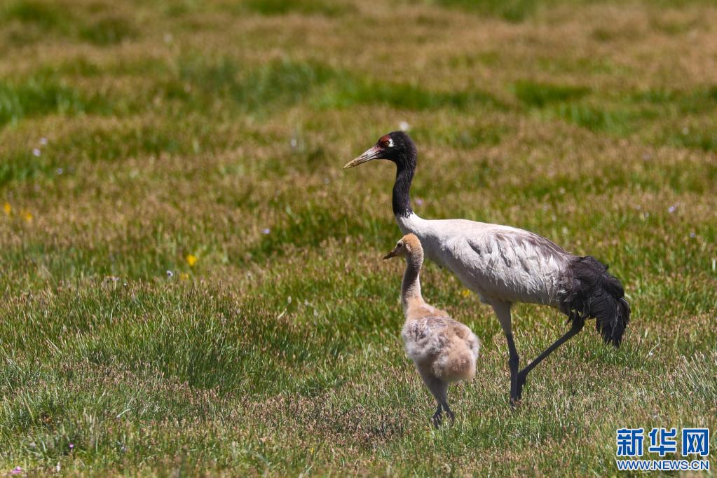 西藏改則縣麻米鄉(xiang) 成長中的黑頸鶴(2022年7月25日)。新華社發(邊巴 攝)