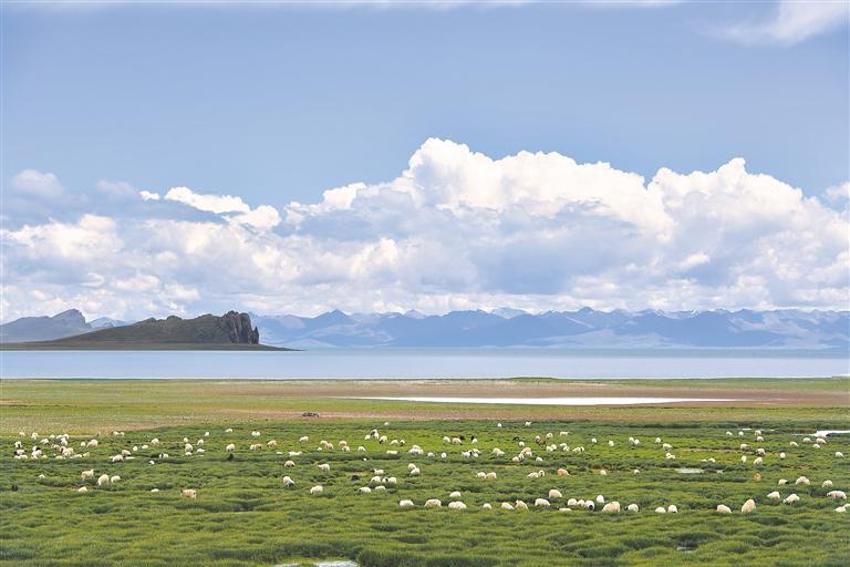 圖為(wei) 在藏北高原,羊群在悠閑地吃草。記者 鹿麗(li) 娟 攝