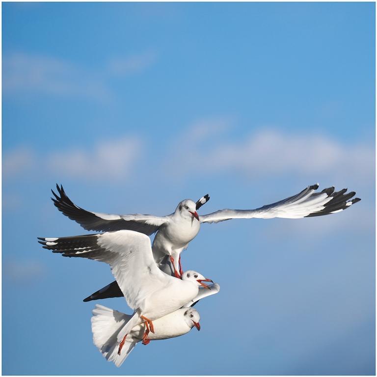 圖為(wei) 在拉薩河畔,三隻紅嘴鷗在空中嬉戲。
