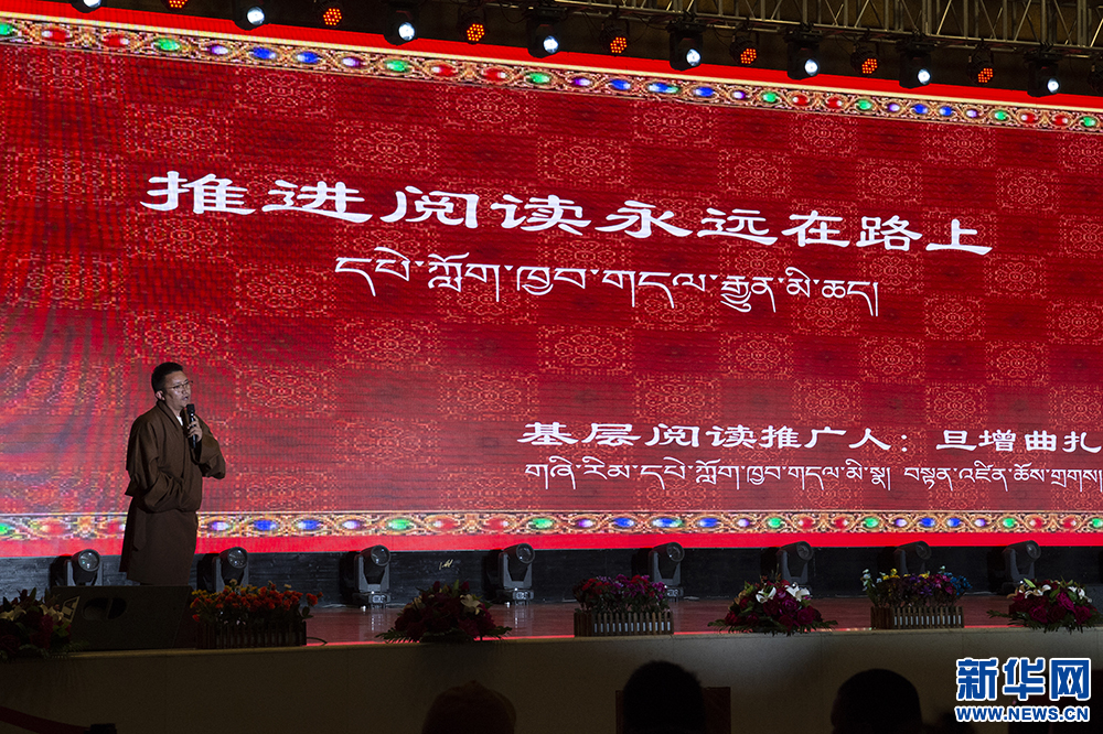 4月23日,基層閱讀推廣人旦增曲紮在展示基層閱讀推廣成果。新華網 旦增努布 攝