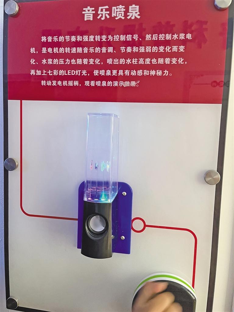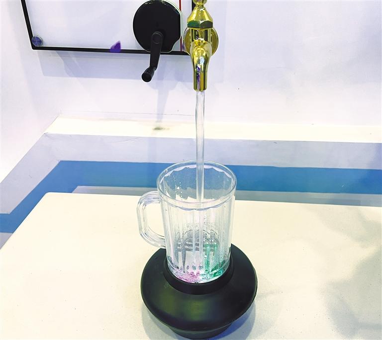 “這個(ge) 體(ti) 驗項目叫‘天上來水’。設計者巧妙設計水流通過水泵及透明玻璃管壓入水龍頭內(nei) ,在封閉的水龍頭出口處將水溢出管口,溢出的水又將玻璃管隱蔽,水流的循環造成觀眾(zhong) 難以發現特殊裝置的奧秘,從(cong) 而形成人為(wei) 製造的錯覺。”體(ti) 驗結束後,索央向小朋友解釋“天上來水”的科學原理。