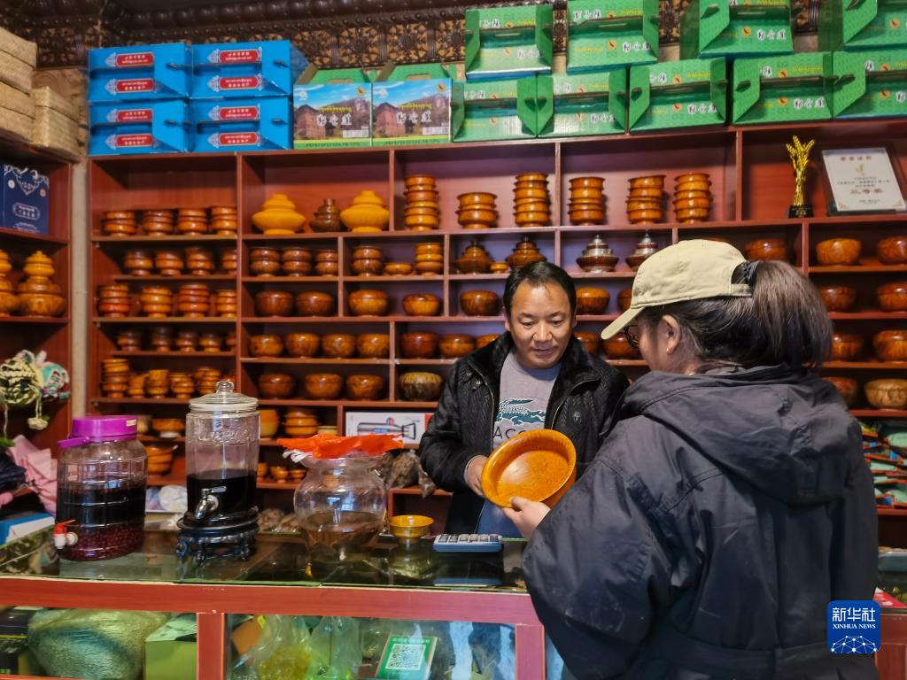 4月24日,遊客在山南錯那市麻麻鄉(xiang) 次仁家的民宿中購買(mai) 木碗。新華社記者 劉洪明 攝