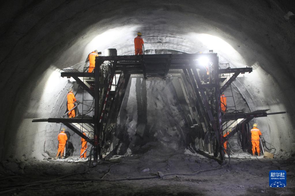 在拉薩至日喀則高速公路帕當山隧道,工人正進行掌子麵打眼作業(ye) 。(中鐵二十一局供圖)