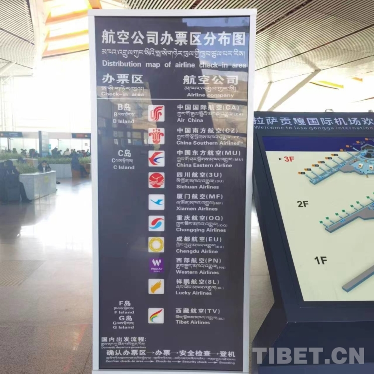 無托運行李的旅客持個(ge) 人身份證(或有效證件)前往自助值機區打印登機牌。有托運行李和中轉聯程航班的旅客前往人工櫃台辦理。其中,乘坐西藏航空公司航班的旅客進入出發大廳後左轉前往F、G島辦理乘機手續,其他航空公司的旅客請前往B、C、D島辦理乘機手續。