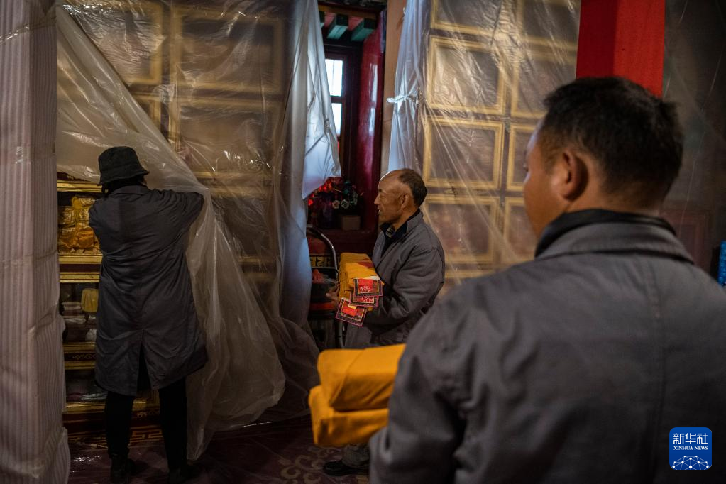 久米次成(左)與(yu) 同事搬運準備進行普查登記的古籍(4月19日攝)。新華社記者 晉美多吉 攝