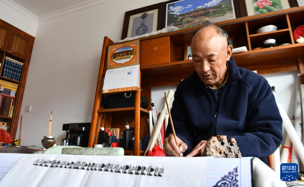 久米次成在家中撰寫(xie) 梵文書(shu) 法(4月19日攝)。新華社記者 晉美多吉 攝