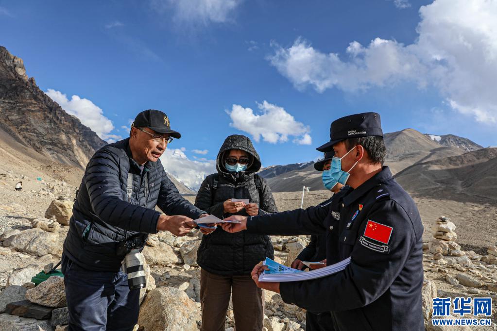 珠峰邊境派出所民警為(wei) 景區遊客發放安全注意事項宣傳(chuan) 單。