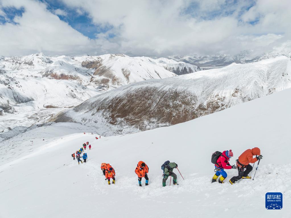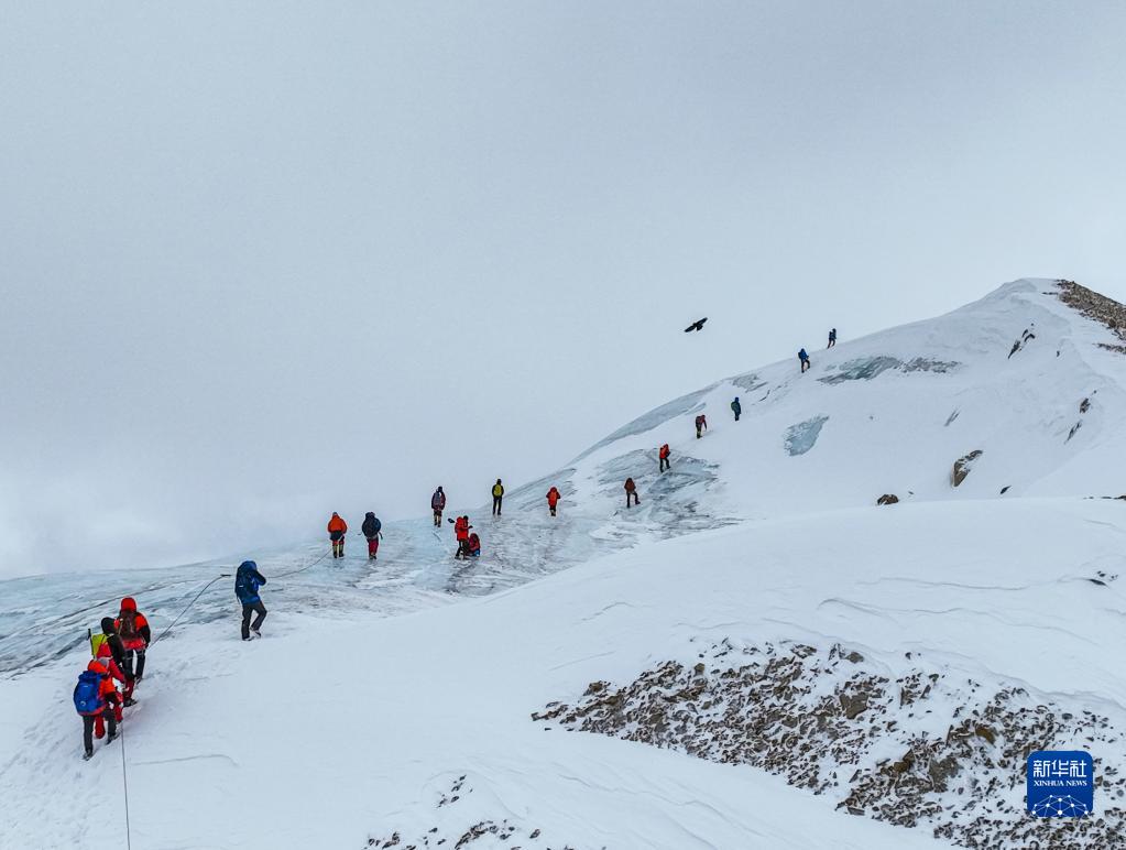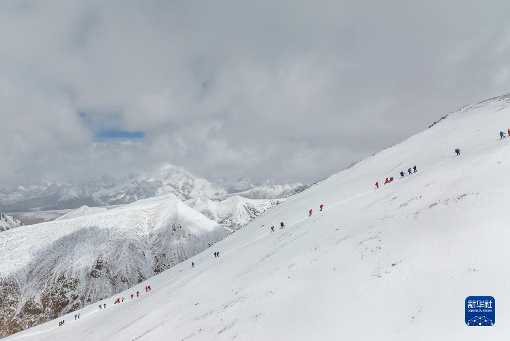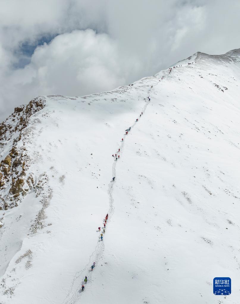 5月3日,登山愛好者正在向海拔6010米的洛堆峰峰頂進發(無人機照片)。新華社記者 孫非 攝