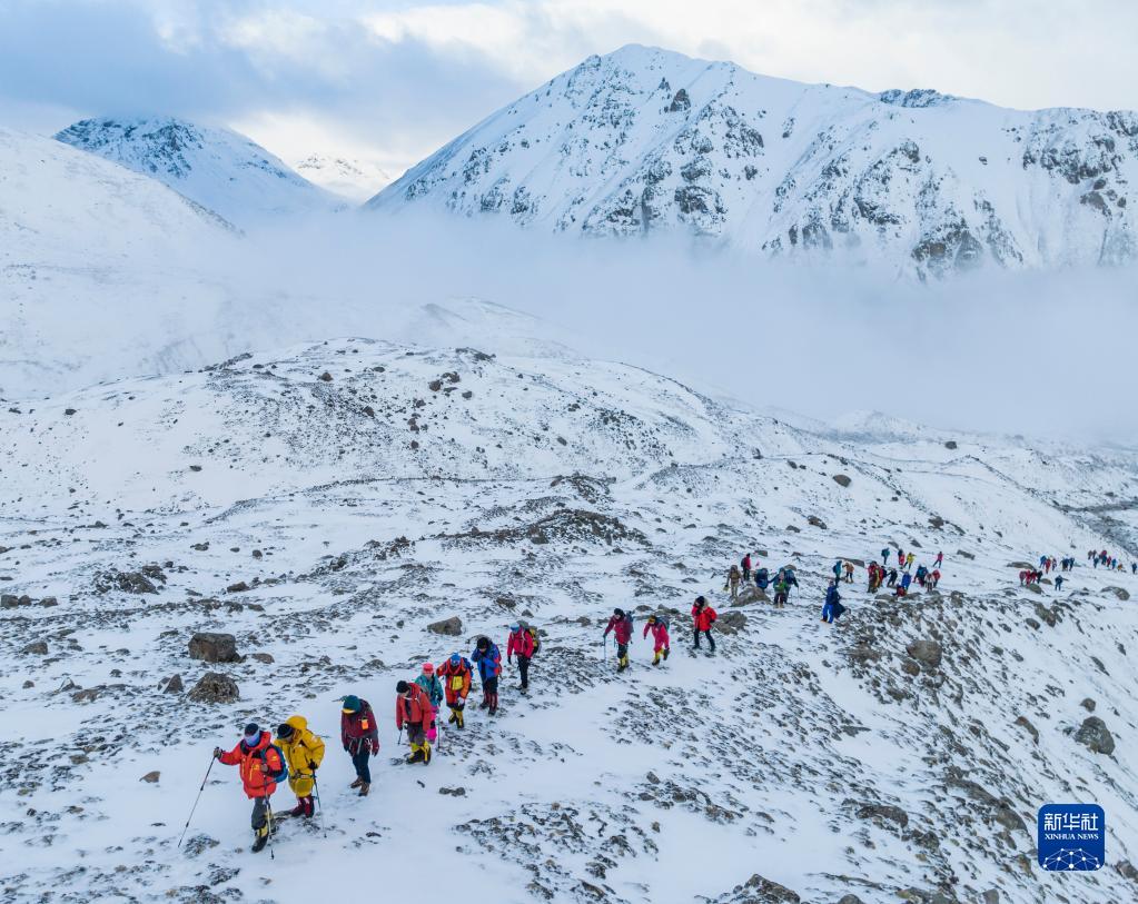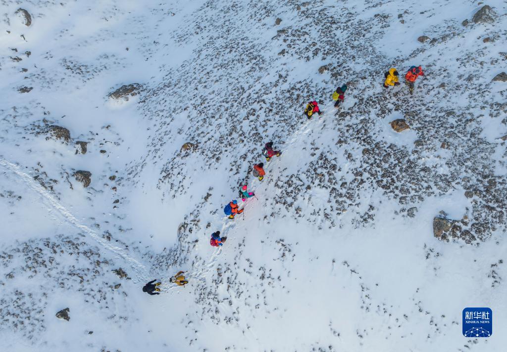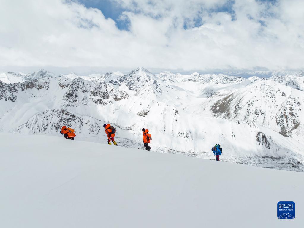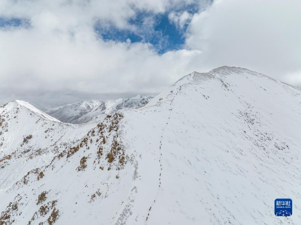 5月3日,登山愛好者正在向海拔6010米的洛堆峰峰頂進發(無人機照片)。新華社記者 孫非 攝