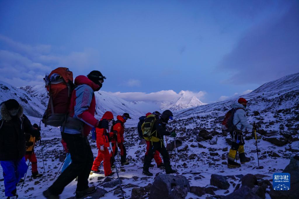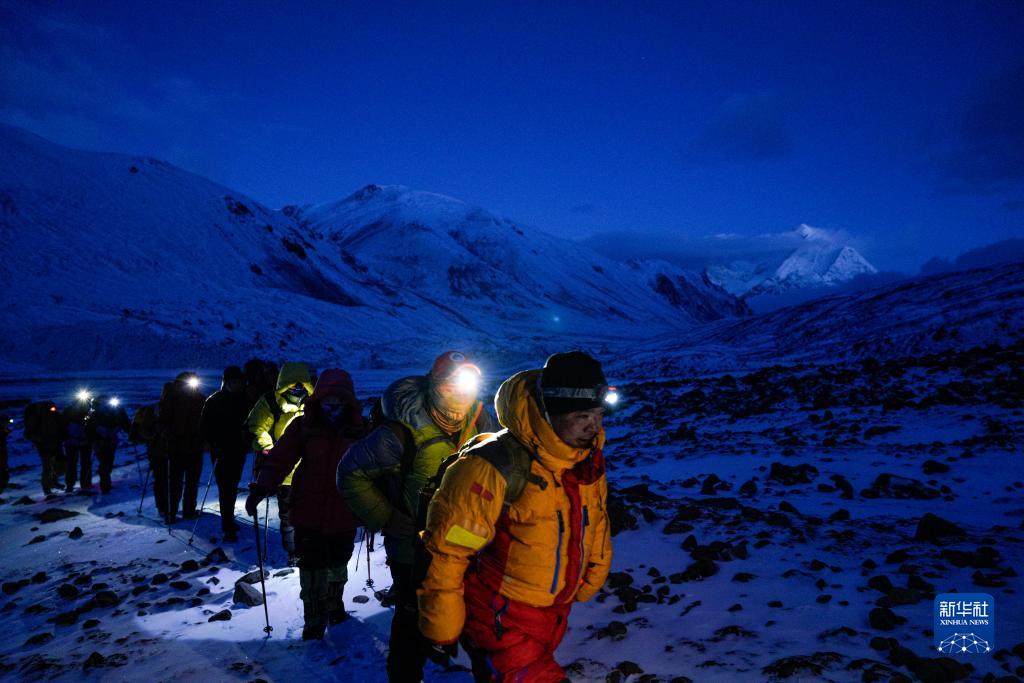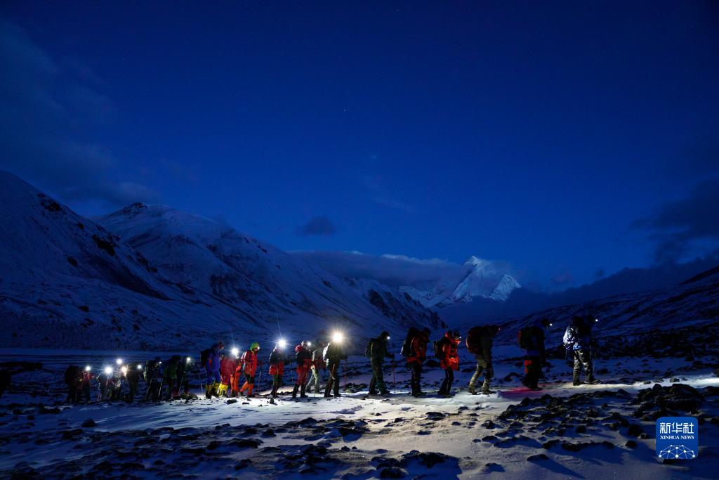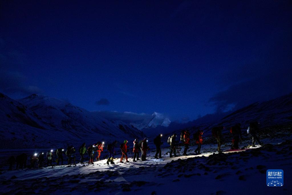 5月3日,登山愛好者在淩晨出發,開始攀登海拔6010米的洛堆峰。新華社記者 孫非 攝