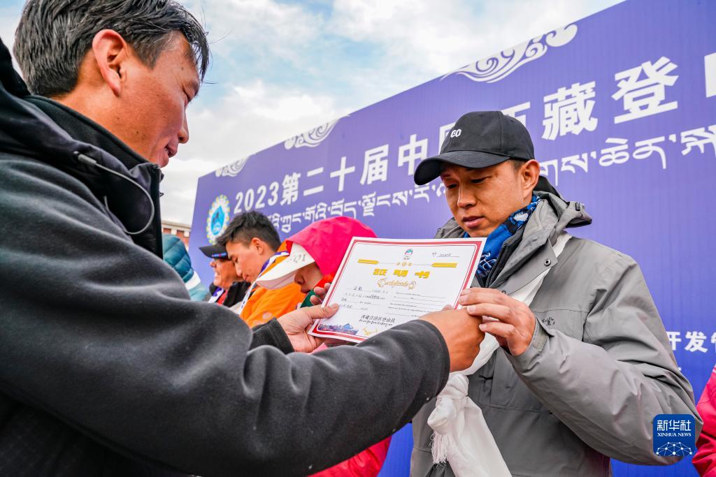 5月3日,工作人員向登山愛好者頒發登頂證書(shu) 。新華社記者 孫非 攝