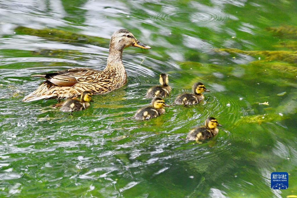 一隻母綠頭鴨帶著小鴨在拉魯濕地暢遊覓食(5月6日攝)。新華社記者 張汝鋒 攝