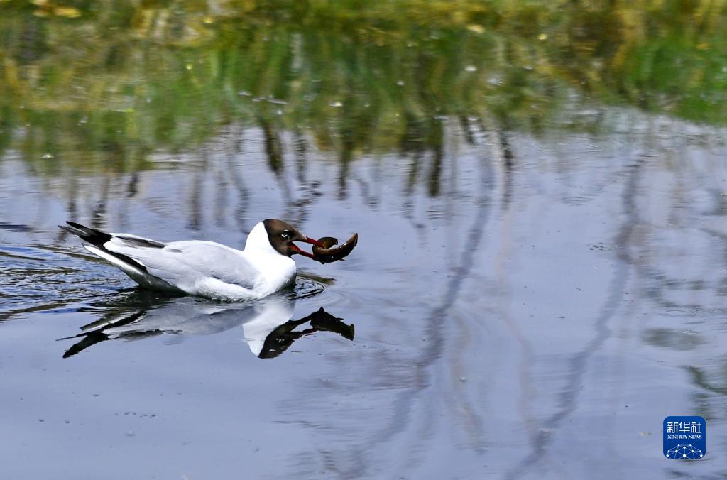 拉魯濕地水麵上叼著泥鰍的棕頭鷗(5月6日攝)。新華社記者 張汝鋒 攝
