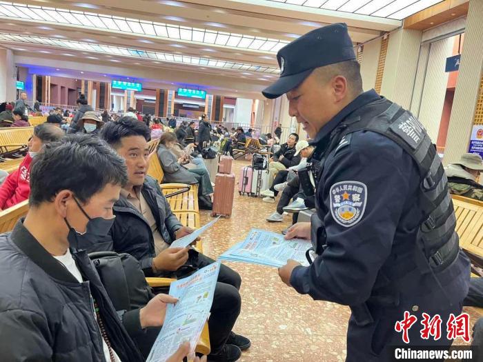 圖為(wei) 拉薩鐵路公安民警為(wei) 遊客發放宣傳(chuan) 冊(ce) 。 貢嘎來鬆 攝