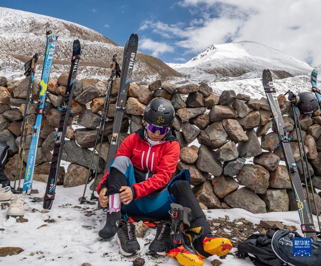 在西藏拉薩市當雄縣羊八井鎮,玉珍拉姆(左二)和隊友進行滑雪登山訓練(5月2日攝)。新華社記者 孫非 攝