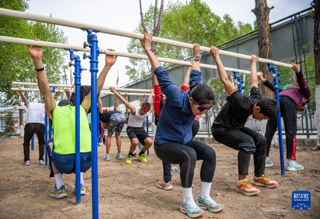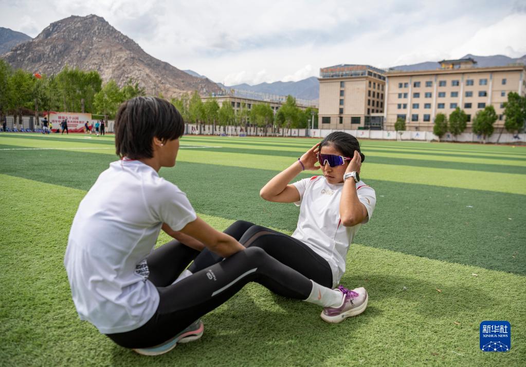 在西藏自治區體(ti) 育運動技術學校,玉珍拉姆(右)在訓練中做仰臥起坐(4月29日攝)。新華社記者 孫非 攝