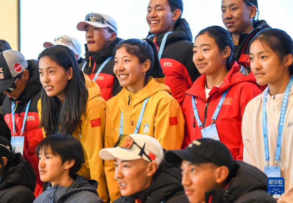 在新疆富蘊縣,玉珍拉姆(中排右三)和參與(yu) 全國首屆滑雪登山冠軍(jun) 賽的西藏代表隊隊友合影留念(4月7日攝)。新華社記者 胡虎虎 攝