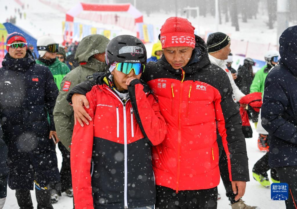 在全國首屆滑雪登山冠軍(jun) 賽短距離(女子組)比賽後,西藏代表隊教練組人員安慰在比賽中失誤的玉珍拉姆(前左)(4月8日攝)。新華社記者 胡虎虎 攝