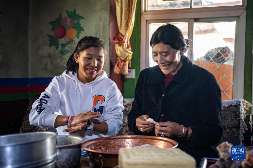 在位於(yu) 西藏林芝市工布江達縣仲莎鄉(xiang) 的家中,玉珍拉姆(左)和媽媽一起做土豆包子(4月24日攝)。新華社記者 孫非 攝